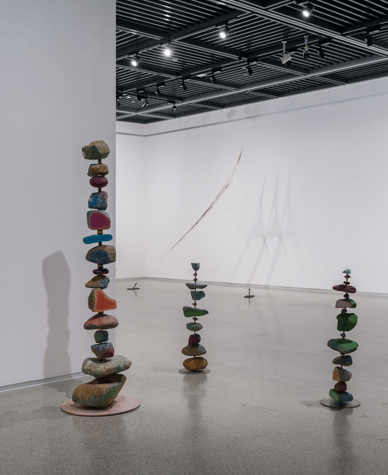 除了架上绘画与雕塑,装置作品在展览中同样承担着“超理性”理念的表达使命。策展人邵译农自身创作的《无度之觉》《寅卯辰巳》系列装置,以漂浮木、石权、钢筋、木头等自然与工业材质为载体,将时间的痕迹、自然的肌理与工业的冰冷相融,构建出充满禅意的空间形态,传递对“身、心、灵与宇宙能量合一”的追求;谭勋的《彩虹中国计划--彩虹石》系列雕塑,以彩色大理石为原材料,通过拼接、拼贴的方式,延续对中国城市化进程的思考,将“彩钢板”所代表的时代印记,转化为兼具当代张力与自然质感的艺术作品,实现了观念与材质的完美融合;汪国虎的《大房》《小房》则以彩色塑料膜、竹子为材质,在自然与人工的碰撞中,通过色彩生成空间,让作品自身成为诠释自然与人类关系的载体,引导观众回归对空间本真的感知。