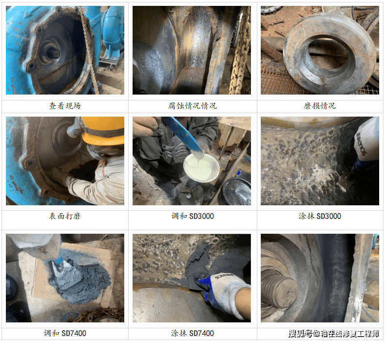 第一种是索雷碳纳米聚合物材料防护修复法,也是目前工业现场应用最广泛的高效方案。该方法无需拆卸泵体整机,仅需抽出叶轮即可开展在线修复,大幅缩短停机时间,尤其适合紧急故障处理。操作核心分为三步:首先清除泵壳体内残留物,用无水乙醇彻底清洗,确保修复表面无油污、无杂质;随后对壳体流道、腐蚀磨损部位进行打磨处理,直至露出金属原色,再次清洗干燥;最后按比例调和碳纳米聚合物材料(SD3000、SD7400),均匀涂覆于受损部位,反复刮涂保证密实度,待材料固化后清除多余部分,即可完成修复。该材料具备优异的粘结力、耐磨性和耐腐蚀性,能有效隔绝腐蚀介质与金属基材接触,同时抵御固体颗粒冲刷,修复后使用寿命优于传统工艺,且综合成本远低于更换新部件。